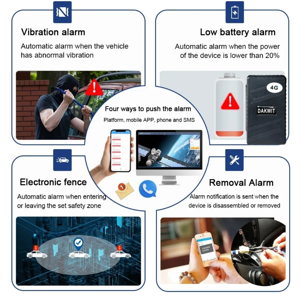 Alertas: SOS, excesso de velocidade, começar a se mover, entrar/sair da Geo-cerca e bateria fraca.Coloque em um carro, bolso, mochila, bagagem, remessa ou embaixo de um carro com o forte acessório magnético fornecido.
